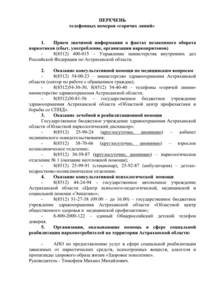 8(8512) 51-04-28 – антинаркотическая комиссия администрации МО «Город Астрахань»